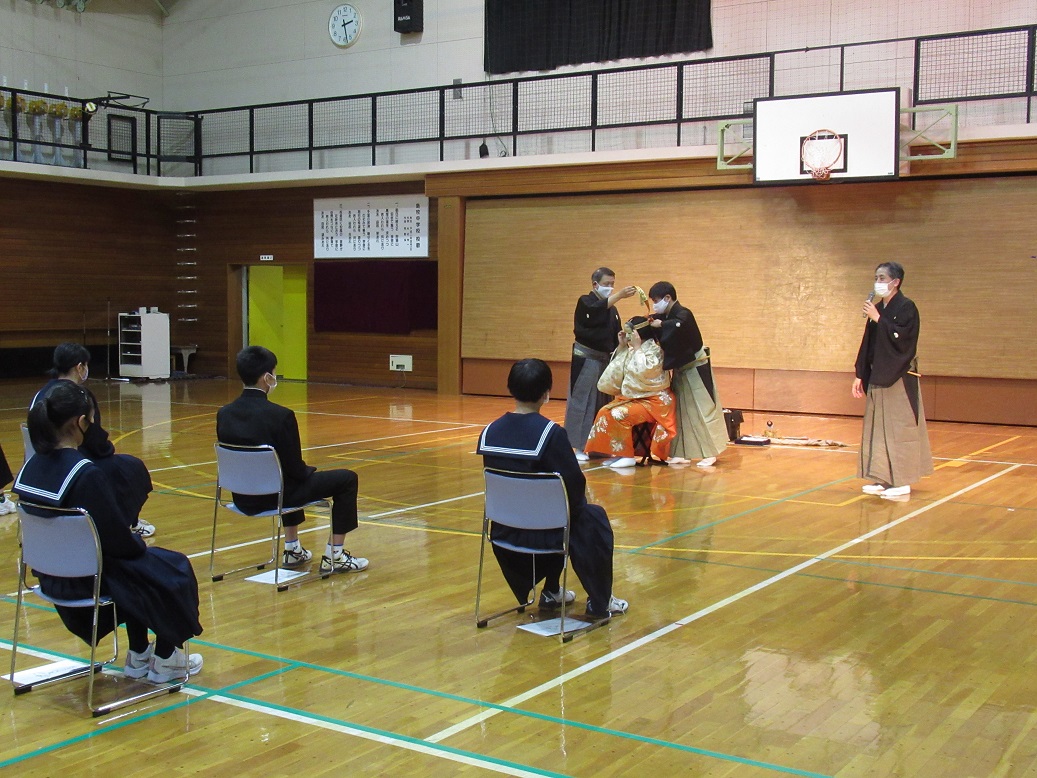 11月19日(木)島牧ä¸å¦æ ¡ã«ã¦ã€èŠ¸è¡“é‘‘è³žäº‹æ¥ãŒè¡Œã‚れ能楽を楽ã—ã¿ã¾ã—ãŸã€‚写真ã¯ç‹‚言「柿山ä¼ã€ã®ä¸€å ´é¢ã§ã™ã€‚